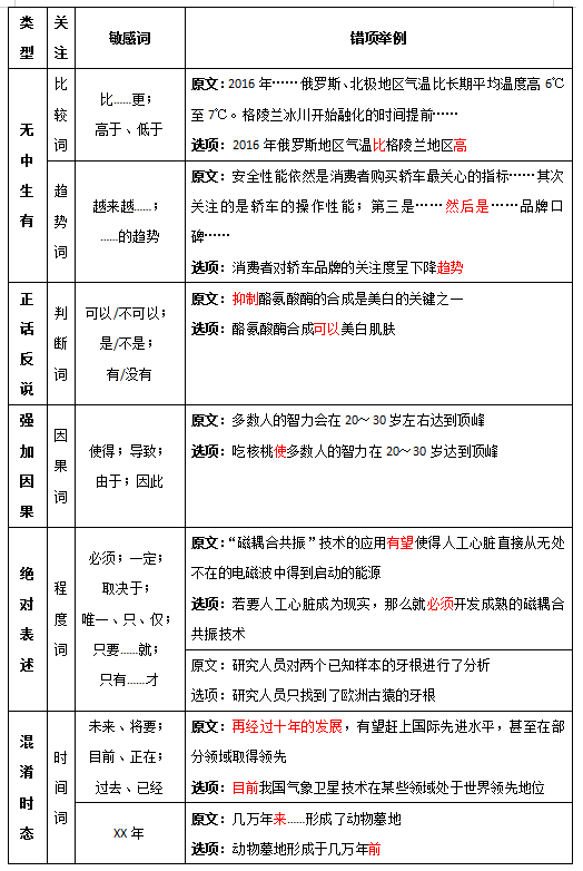 行测试卷中有一类很“神奇”的题叫做细节题——它们整体难度不大,只要细心有余、时间充足,基本上都能做对。可偏偏就是如此简单的它们,让多少公考小伙伴们“意乱神迷”!还记得每次做细节题时的那一声长叹——“唉,又要做细节题了,真浪费时间”吗?还在为每次做细节题不知道从何看起吗?别担心,且听中公教育专家给大家分析一二。与主旨观点题等其他片段阅读不同,细节题最主要的是判断对错,重点在于分析选项,可以说是选项维度。因此,了解选项设错类型或者说选项中易设错的敏感词,然后带着这些去对比原文,这样将大大降低我们的做题难度,缩短做题时间。中公教育专家这里给大家总结了细节题中常见的八大选项设错类型,并且分别给出了相应的选项关注点、设错敏感词以及错项举例。大家赶快一起来学习一下吧!