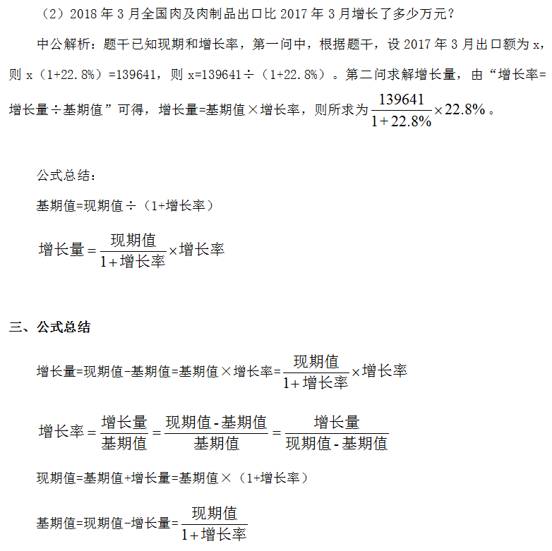 增长中,考查的就是增长量、增长率、现期值、基期值四个概念间的相互计算,往往已知其中两个量,求解另外的某个量。