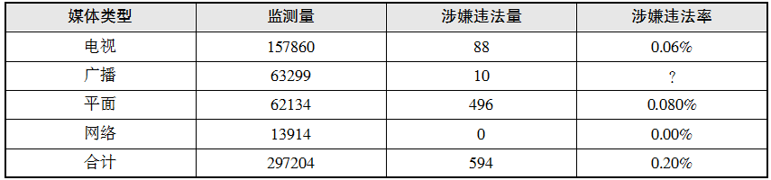 2015年7月,D市共监测电视、广播、平面和重点网络媒体首页面面广告297207条次,涉嫌违法广告594条次,广告涉嫌违法率0.20%,比6月下降0.07个百分点。
