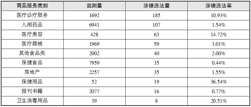 表2 2015年7月广告涉嫌违法量居前十位的商品、服务类别(单位:条次)