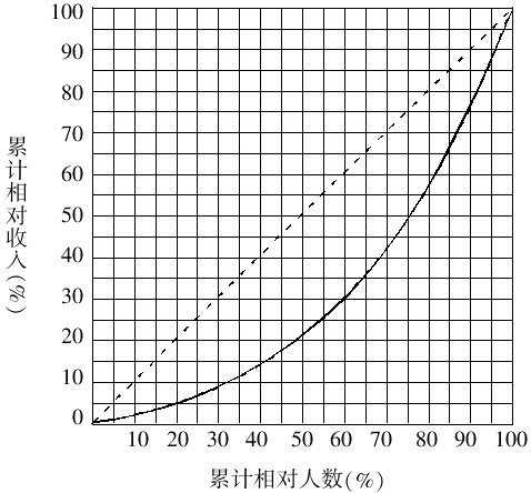 累计收入分配曲线是一种衡量收入分配不平等程度的曲线,如下图所示。如果收入分配是绝对平衡的,即1%的人口得到1%的收入,则累计收入分配曲线为图中的虚线,实际收入分配情况往往如图中实线所示。