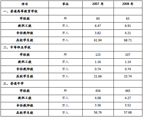 A.相对于2007年,2008年教职工人数唯一下降的是中等职业学校