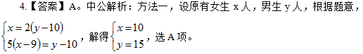 方法二,由“女生人数是男生人数的2倍”可知,女生人数能被2整除,排除B、D;代入A项,满足题意,故选A。