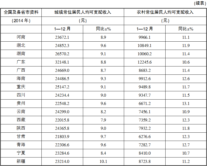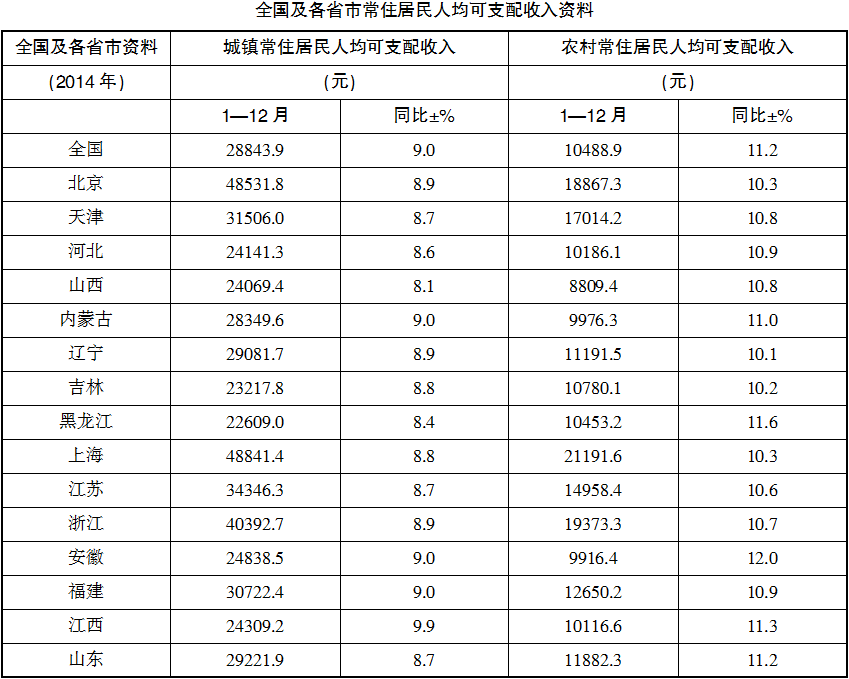 A.表中31个省市中多数以上2014年农村居民人均可支配收入超过万元