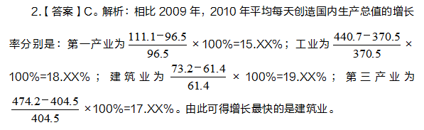 1. 【答案】C。解析:2010年建筑业平均每天创造国内生产总值73.2亿元,2010年有365天,所以2010年全年创造国内生产总值为(73.2×365)亿元,由尾数法可得小数点后面为零,只有C项符合。