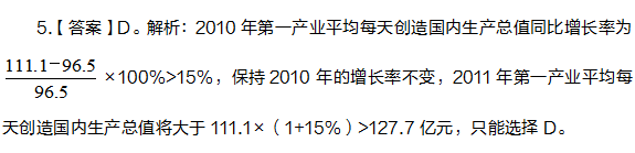 4.【答案】C。解析:由题意可知,2010年第一、二产业增加值不变,第三产业比重提高到60%,即第一、二产业的比重为40%,那么2010年平均每天创造国内生产总值合计为(111.1+513.9)÷40%=1562.5亿元。