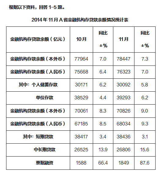 5.【答案】C。解析:个人储蓄存款环比下降,A错误;2014年11月个人储蓄存款和短期贷款同比增速低于10月,B错误;2014年11月,金融机构存款余额(本外币)和金融机构贷款余额(本外币)均高于10月,C正确;2014年10月,A省金融机构存款余额(人民币)>个人储蓄存款和单位存款之和,D错误;故选C。